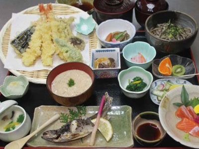 【信州プレミアム牛すき焼き、信州サーモンお造り、小天ぷら、茶碗蒸し、小鉢3品、御飯、味噌汁、漬物、果物】